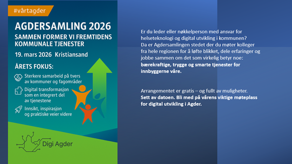Digi Agder og e-helsegruppen inviterer alle Agderkommunene til en felles dagssamling med fokus på samarbeid. Samlingen retter seg mot ledere og andre dedikerte ressurser med beslutningsmyndighet og ansvar for implementering av helseteknologi som en integrert del av kommunens tjenester.